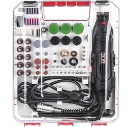 Комплектация: гравер; гибкий вал; ключ гаечный; комплект аксессуаров – 218 шт.; руководство по эксплуатации; кейс.