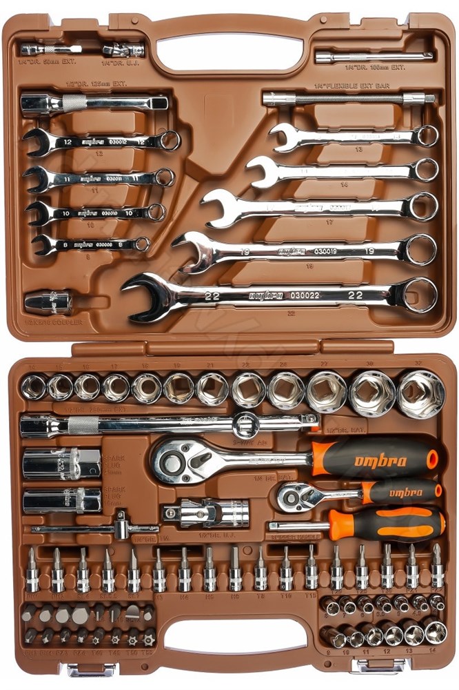 OMBRA OMT82S это универсальный набор инструментов 82 предмета отлично подходит для работ в сфере ремонта автомобилей, а также в различных других ремонтных сферах, ключи, торцевые головки, переходники и трещотки покрыты двойным хром-ванадиевым напылением, удобные прорезиненные рукоятки не дают инструменту скользить в руках, в комплект входят биты самых разнообразных модификаций, гибкий вал-удлинитель поможет мастеру подобраться в самые труднодоступные места, также в него входят и свечные головы различных размеров.
